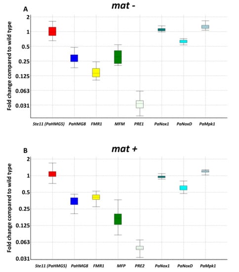 RT-qPCR expression of selected genes in ∆pro1 mutants. (A) PaPro1∆ mat− versus wild type mat−. Normalization genes selected with geNorm are CIT1, GPD and TBP, with an average stability value M = 0.08 and V3/4 = 0.025 (Table_SI_3_geNorm). (B) PaPro1∆mat+ versus wild type mat+. Normalization genes selected with geNorm are CIT1, GPD and TBP, with an average stability value M = 0.10 and V3/4 = 0.024 (Table_SI_3_geNorm). Expression ratios of the following genes have a p-value below 1% and their CI 95% does not include 1: HMG8, mating-type genes (FMR1, FPR1), pre-propheromone genes (MFM, MFP), pheromone-receptor genes (PRE1, PRE2), PaNoxD and PaMpk1. In contrast, STE11 and PaNox1 did not show any statistically significant difference of expression ratio in any conditions.