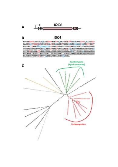 (A) Structure of the IDC4 gene: red boxes are exons. (B) Structure of the IDC4 protein. The AIM24 domain is underlined. The prolines are in red and the glutamines in blue. The position of the glutamine codon changed into a stop codon in IDC508 is boxed. (C) Phylogenetic tree constructed with selected IDC4 paralogues and/or orthologues.