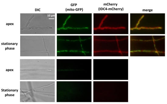 Cellular localization of IDC4. The two top rows are the strain carrying the mito-GFP and IDC4-mCherry transgenes. Red fluorescence in apical and stationary phase hyphae from 3-day-old hyphae carrying both transgenes was located in the cytosol, while the green fluorescence was detected in elongated mitochondria. The two bottom rows are from the wild type that does not carry transgenes; no fluorescence was detected in the wild type.