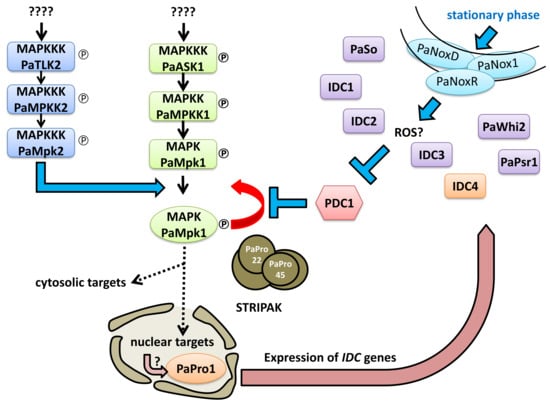 Orthologues of PaPro1 have previously been investigated in N. crassa [49,53], E. festucae [54,55], Alternaria brassicola [56], Cryphonectria parasitica [57], Fusarium graminearum [58], Aspergillus nidulans [59,60], Aspergillus fumigatus [61], and especially in S. macrospora, in which this transcription factor was discovered [33,34,39,40,41]. These studies identified target genes regulated by this transcription factor, including orthologues of some of the pink IDC genes (Table 2) and among them orthologues of PaNoxD, PaNox1 and PaMpk1 [39,40,41,54,55,57]. RT-qPCR showed that PaNoxD and PaMpk1 transcripts were down- and up-regulated, respectively in the PaPro1Δ mutant, while PaNox1 transcription level was not significantly changed. Additionally, analyses of the microarrays from [38] showed that PaPro1 transcription was not modified in the PaNox1, PaMpk1 and PaMpk2 mutants. Based on these data, we propose that PaPro1 is a regulator of the expression of the IDC genes (Figure 7). This is confirmed by the PaPro1Δ PDC1Δ double mutant analysis that indicated that PaPro1 acts likely upstream of the MAPK cascades. However, owing to the postulated self-regulatory loop present in this cascade [4], it remains to be determined whether PaPro1 is a phosphorylation target of the PaMpk1/PaMpk2 MAP kinases. Based on the phenotype of the IDC mutants, we previously hypothesized [4,5] that the PaPro1-containing signaling pathway controls entrance into stationary phase, i.e., the nutrient starvation response, a feature also more recently found in E. festucae for its orthologue ProA [55].