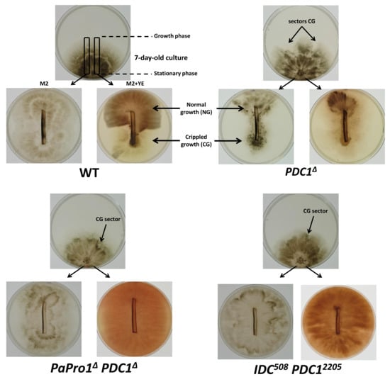 Epistasis analysis with PDC1 mutants. CG test were made as in Figure 1, i.e., slices were taken on seven-day-old mycelia with the indicated genotypes and reinoculated either on M2 or on M2 containing YE. Pictures were taken seven days later. For the wild-type this resulted in the development of CG only on medium containing YE, whereas for the PDC1Δ mutant, CG developed on both media. The PaPro1Δ PDC1Δ and IDC508 PDC2205 double mutants exhibited spontaneous CG sectors on M2, but could not be induced to present CG after passage into stationary phase.