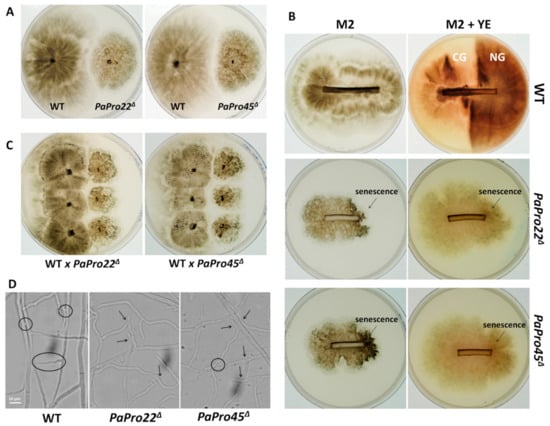 Phenotypes of PaPro22Δ and Papro45Δ. (A) The wild type (WT), PaPro22Δ and Papro45Δ were inoculated at the same time on M2 plates and the pictures were taken ten days later. PaPro22Δ and Papro45Δ have a slow growth, are devoid of aerial hyphae, but accumulate pigments. (B) CG test were made as those of Figure 1 and Figure 7. Apical hyphae of PaPro22Δ and Papro45Δ show after 3–4 cm the arrest of growth and accumulation of dark pigments typical of senescence. (C) Sexually compatible mycelia of the indicated genotypes were inoculated on M2 and three days later 2 mL of water were added to spread spermatia. The wild-type thalli differentiated after seven days mature perithecia, but not the mutant ones, showing that PaPro22Δ and Papro45Δ were ♀-sterile and ♂-fertile. Perithecia are the small black dots. (D) Anastomoses (open circle) are frequent in the wild-type, but very rare in PaPro22Δ and Papro45Δ (a field in which one figure of anastomose was seen is shown for the Papro45Δ mutant, in most fields anastomoses could not be observed). Hyphae from PaPro22Δ and Papro45Δ often meet, but do not engage cell fusion (arrows).