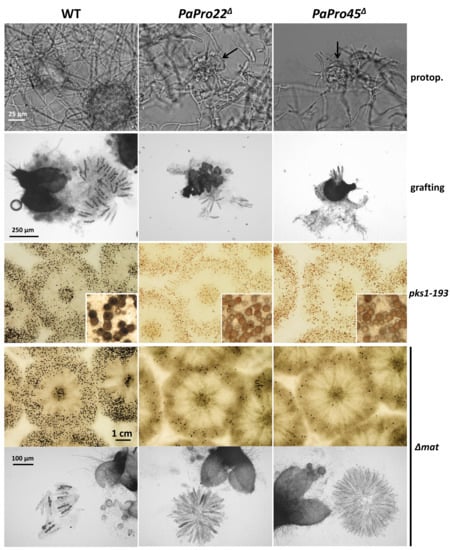 Fertility defect of the PaPro22Δ and Papro45Δ mutants. From top to bottom: Both PaPro22Δ and Papro45Δ differentiate small and abnormal-looking protoperithecia (arrows). Wild type perithecia grafted onto PaPro22Δ and Papro45Δ mycelia stopped their development, while those grafted onto wild type (WT) continued their development by enlarging and producing abundant progeny. Heterokaryons between psk1-193 and the PaPro22Δ and Papro45Δ mutants produced only non-pigmented fruiting bodies, while those made with the wild-type produced both pigmented and non-pigmented fruiting bodies. Trikaryons between PaPro22Δ and Papro45Δ produced few perithecia, unlike the wild type. These did not contain mature asci; observation of the rosette of asci in the mutants showed that their maturation was blocked before ascospore delimitation.