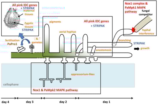 With the identification of PaPro1 and IDC4, all the genes mutated in the available pink IDC mutants are now documented (Table 2). The analysis of these mutants recovered by forward genetic analyses of CG has shown that the IDC proteins are all involved in signaling in P. anserina. They ensure functions that are conserved in a wide range of fungi, especially in the Pezizomycotina in which they have been shown to control anastomosis, which is mostly studied in N. crassa (reviewed in [64]), and fruiting body development, mostly analyzed in S. macrospora (reviewed in [65]). They also control interactions with hosts in phytopathogens (see for a review [66]), entomopathogens (e.g., [67]) and plant mutualistic fungi (e.g., [54,68,69]). Especially, some IDC genes, but not all, are involved in the production of functional appressorium and appressorium-like structures [70,71]. Because in both N. crassa and S. macrospora, the orthologues of the IDC genes work along those encoding for the STRIPAK complex [64,72,73], we deleted the P. anserina orthologues of pro22 and pro45, encoding two different subunits of the STRIPAK complex, to assess their role in CG and more generally in P. anserina development. Both mutants had features closely resembling those of typical “pink” IDC mutants: lack of CG, lack of aerial hyphae and anastomosis, female sterility, while retaining the ability to differentiate female gametangia. They however differed from typical “pink” IDC mutants by having abnormally shaped hyphae, being slow-growing, short-lived, pigmented and blocked at an early stage during the development of the zygotic tissues. Slow growth of the STRIPAK mutant is also observed in S. macrospora [73] and N. crassa [74]. This indicates that in P. anserina the STRIPAK complex genes have additional roles when compared to those of the typical “pink” IDC genes. Owing to their lack of anastomosis, including when confronted with the wild-type, we could not easily assess whether they do or do not make the C element, a problem that we previously encountered with mutants of the PaMpk2 pathway [12]. Whatever their actual role in CG, their slow-growing and short-lived phenotypes likely prevented their retention during the genetic screens performed to select for IDC mutants [2].