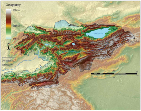 - Kyrgyzstan Topography. Available online: https://en.wikipedia.org/wiki/File:Kyrgyzstan_topography.pdf (accessed on 26 June 2019).