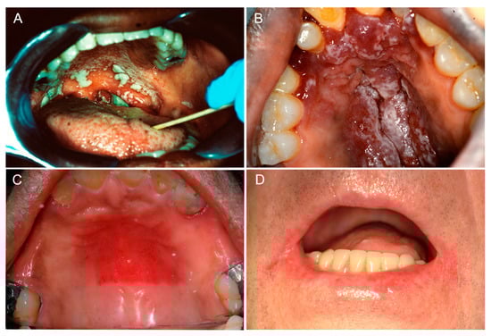 Angular cheilitis, as the term implies, affects the angles or commissures of the mouth and presents with erythema, maceration, fissuring, crusting, or a combination thereof (Figure 1D). The presentation may be unilateral but is more often bilateral. Angular cheilitis is commonly associated with DS or another pre-existing primary form of OC where the elevated numbers of Candida in the oral cavity result in direct spread and auto-inoculation of the angles of the mouth [3,14]. Furthermore, it is not uncommon for these lesions to be co-infected with Staphylococcus aureus and, therefore, the exact role that Candida itself plays in the infection is difficult to ascertain. One important predisposing factor is the reduced vertical occlusal dimension in elderly edentulous patients, predisposing individuals to exuberant redundant folds and maceration. Importantly, angular cheilitis can be secondary to hematinic deficiencies warranting further investigation with blood tests.