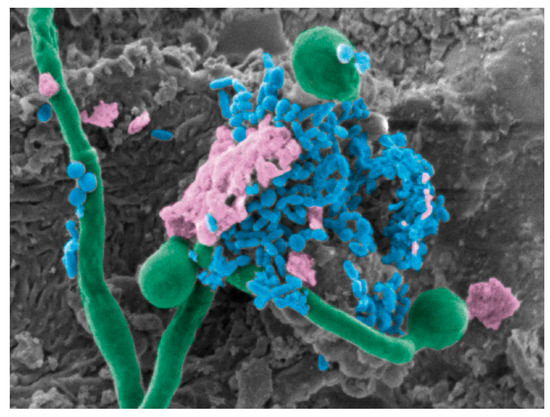 Co-infection of Streptococcus mutans and Candida albicans. SEM pseudo-colored micrograph of a mouse tongue dorsum showing C. albicans hyphae (green) penetrating epithelial cells with S. mutans (blue) cells anchoring onto hyphae within a dense extracellular matrix (pink), 10,000x magnification.