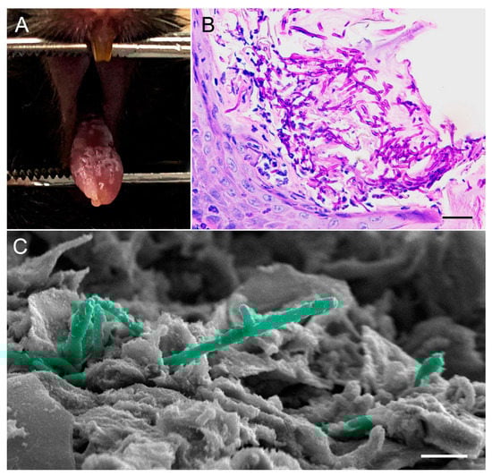 Mouse model of oral candidiasis. (A) Diffuse white plaques with focal areas of punched-out white lesions on the tongue dorsum of a mouse depicting oral candidiasis. (B) PAS-stained image showing significant accumulation and penetration of C. albicans hyphae through the hyperkeratotic surface of the tongue dorsal epithelium. Neutrophilic Munro microabscesses in response to the infection are seen. (C) SEM micrograph, high magnification of the tongue dorsum showing C. albicans hyphae (pseudo-colored in green) penetrating epithelial cells. Bars correspond to (B) 100 µm and (C) 20 µm.