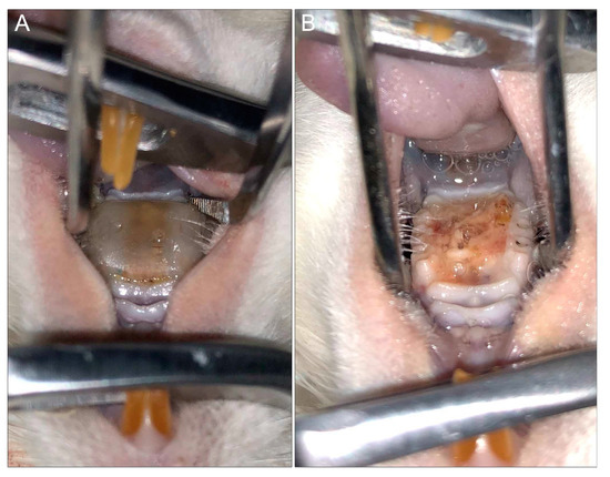 Rat model of denture stomatitis. (A) Three-dimensional (3D)-printed denture with intimate fit to the hard palatal-mucosa of a rat. (B) Denture stomatitis in a rat model demonstrating profound edema and a thick yellow biofilm of the denture-bearing hard palatal mucosa (top: tongue; bottom: hard palate).