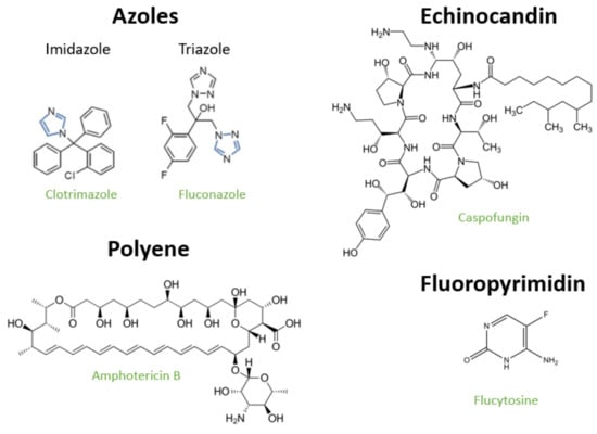Representative examples of the antifungals currently available to treat candidiasis. Chemical structure of representative examples of antifungals (azoles, echinocandins, polyenes and fluoropyrimidines) available, with the class of the drug being highlighted in black bold while the name of the drugs is shown in green. The nitrogen-based ring that distinguishes imidazoles (clotrimazole) from triazoles (fluconazole) is highlighted in blue.