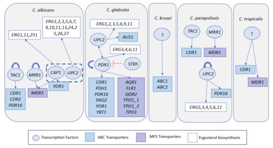Schematic representation of regulatory associations between regulators involved in azole resistance and genes encoding multidrug resistance efflux pumps demonstrated to be involved in azole resistance in Candida spp. The information concerning the regulatory associations between transcription factor and target genes was retrieved from the PathoYeastract database [84]. Although ABC-MDR and MFS-MDR transporters involved in azole resistance in C. krusei and C. tropicalis had been identified, until so far the regulators of these genes remain to be characterized.