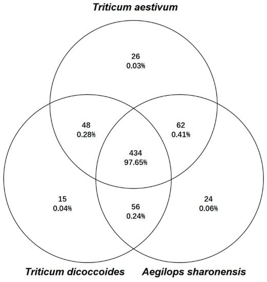 The dataset of 1687 taxa across 530 samples was filtered to remove singletons and doubletons, resulting in a final dataset of 1666 taxa in 530 samples. We further removed rare taxa with incidence <5 (1001 taxa, 1.28% of total abundance), resulting in a core dataset of 665 taxa across 530 samples. In this core dataset, 396 taxa were assigned to 159 genera, in which 253 taxa were assigned at species level. In addition, 434 taxa, which accounted for 97.65% of the reads, were found in all three plant species (Figure 2). T. aestivum, Ae. sharonensis, and T. dicoccoides each contained 570, 576, and 553 taxa with 26, 24, and 15 unique ones, respectively. The host-specific taxa had low abundance and collectively accounted for only 0.13% of the reads. Therefore, the core set of FECs showed a generally overlapping pattern. The vast majority of fungal taxa were assigned to the phyla Ascomycota (69.47% of total taxa) and Basidiomycota (21.50%). Among the remaining taxa, five were assigned to Mucoromycota and Mortillomycota, and 55 taxa could not be assigned at phylum level. At class level, Dothiomycetes were the dominant class in all three plant species, followed by Tremellomycetes and Sordariomycetes (Figure 3), while taxa belonging to the family Pleosporaceae were the most abundant taxa in FECs from the two wild plant species, but not in wheat (Figure S1). Compared to Ae. sharonensis and T. dicoccoides, the wheat FECs had less abundant Dothideomycetes and more abundant Saccharomycetes and unassigned.