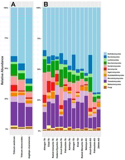 - Ofek-Lalzar, M.; Gur, Y.; Ben-Moshe, S.; Sharon, O.; Kosman, E.; Mochli, E.; Sharon, A. Diversity of fungal endophytes in recent and ancient wheat ancestors Triticum dicoccoides and Aegilops sharonensis. FEMS Microbiol. Ecol. 2016, 92, fiw152. [Google Scholar] [CrossRef]