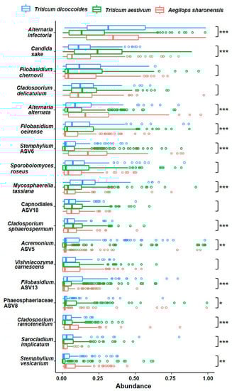 To make a statistically robust prediction of differentially abundant taxa, and to account for variable library sizes, the differential enrichments of fungal taxa between T. aestivum and T. dicoccoides, and between T. aestivum and Ae. sharonensis, were evaluated with DESeq function in “DESeq2” package [36], which take sizes and dispersion of data into consideration.
