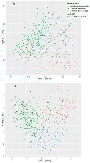 Ordination analyses were used to decipher the possible influence of the three plant species on the structure of FEC compositions across the seven geographical locations. PCoA for abundance (Bray–Curtis dissimilarities) and incidence (Dice dissimilarities) showed clear differentiation among FECs from the different plant species (Figure 6A, Figure S1A). CAP plot showed clearly separated communities by hosts (ANOVA: F = 13.17, p < 0.001), although the small effect on CAP axis suggested that the host had a relatively small effect on FEC structure (Figure 6B, Figure S1B). ANOSIM analysis based on both abundance and incidence datasets revealed significant differences among hosts and sampling sites. PERMANOVA analysis with Bray–Curtis dissimilarity matrix confirmed that both the plant species and sampling sites had a significant effect on the compositions of FECs (sites: F = 11.07, R2 = 0.11, p < 0.001; hosts: F = 15.74, R2 = 0.05, p < 0.001). Similar results were obtained with the Dice dissimilarity matrix (sites: F = 8.23, R2 = 0.08, p < 0.001; hosts: F = 16.18, R2 = 0.05, p < 0.001).