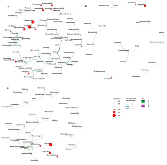 Comparison of the co-occurrence associations among networks of three plants showed that none of them was shared by all three hosts or by T. aestivum and T. diccocides. The co-occurrence between Kondoa and Erythrobasidium was common to Ae. sharonensis and T. diccocides, and the co-occurrence between Crocicreas—Verrucocladosporium—Pringsheimia was common to T. aestivum and Ae. sharonensis (Figure S2). Additionally, Alternaria (most abundant genus) showed a negative co-occurrence with Vishniacozyma in the Ae. sharonensis network.