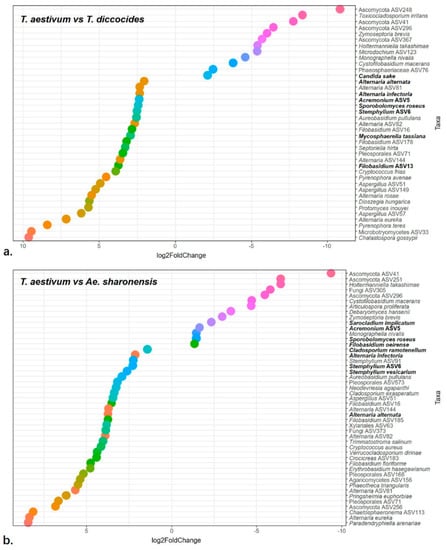 Variance stabilizing transformation of all taxa was performed, in order to identify taxa that are differentially abundant in wheat compared with the two wild plant species (Tables S6 and S7). Comparison of wheat and T. dicoccoides revealed 12 fungal taxa, including the second most abundant species C. sake, that were significantly enriched (>log2 fold change) in wheat, and 27 taxa, including the highly abundant species A. alternate, A. infectoria, Acremonium ASV5, Filobasidium ASV13, M. tassiana, S. roseus, and Stemphylium ASV6, that were significantly enriched in T. dicoccoides (Figure 8a, Table S7). Compared with Ae. sharonensis, 14 fungal taxa including the abundant taxa Acremonium ASV5, F. oeirense, S. implicatum, and S. roseus were significantly enriched in T. aestivum, and 33 taxa, including the abundant taxa A. infectoria, A. alternata, C. ramotenellum, Stemphylium ASV6, S. vesicarium were significantly enriched in Ae. sharonensis. (Figure 8b, Table S7). A number of fungal taxa were significantly enriched in the two wild plant species compared with wheat, including some of the most highly abundant species, such as A. infectoria, A. alternata, A. pullulans, Filobasidium ASV16, and Stemphylium ASV6.