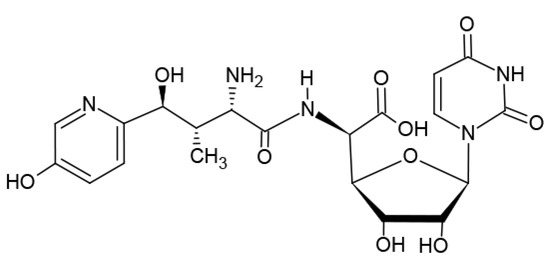 Stenland et al. reported a S. tendae strain engineered to suppress the production of NikX and increase NikZ production, differentiating a manufacturing impurity component that had been challenging to separate [25]. Stenland reported an updated process for “79% [NikZ] purification yield and >98% relative purity of the final product…suitable for further scale up and cGMP production.” [25] (p. 268).