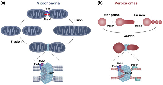 Peroxisomes and mitochondria are highly dynamic organelles whose dynamics are regulated in response to distinct environmental, metabolic, and developmental cues. Mitochondria compose dynamic networks, which undergo constant remodeling involving fusion and fission events. The balance between these processes defines mitochondria arrangement and connectivity and is driven by conserved dynamin GTPases (Figure 1a) [27]. Mitochondrial fusion consists of the sequential fusion of the outer and inner mitochondrial membranes, which are mediated by mitofusins (Mfn1/2/Fzo1) and Optic Atrophy 1 (OPA1/Mgm1), respectively. Mitochondrial fission is conducted by dynamin-related-protein 1 (Drp1/Dnm1), which is recruited to mitochondria by membrane receptor proteins, like Fis1 in fungi (along with the adapter Mdv1), or Mff, MiD49, and MiD51 in mammals. Under specific physiologic conditions, Fis1 also contributes to mitochondrial fission in mammals (reviewed in [27,28]). The sites of mitochondrial fission are defined by physical contacts between mitochondria and the ER, which mediate an initial actin dynamics-dependent constriction and facilitates the assembly of the fission machinery [29,30,31]. Interestingly, mitochondria-ER contact sites also define the site of assembly of the mitochondria fusion machinery and serve to modulate mitochondrial morphology by spatially and bidirectionally coordinating the fission and fusion events [32].