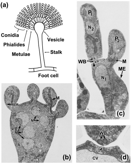 Hyphae are the fundamental cell structure of filamentous fungi, able to differentiate into very specialized cells and to develop complex tissues during fungal development [78]. During asexual development, vegetative hyphae differentiate specialized sporogenous cells that produce spores in several different ways. In most Dikarya fungi, specialized hyphal structures (conidiophores) produce conidia, which are the main form of asexual dispersal in most of these fungi (Figure 2a illustrates the structure of a representative conidiophore). Moreover, hyphal cells are also able to differentiate highly specialized structures that allow fungi to successfully develop diverse lifestyles. These structures include specialized infection structures that allow predatory and pathogenic fungi to trap and invade their hosts.