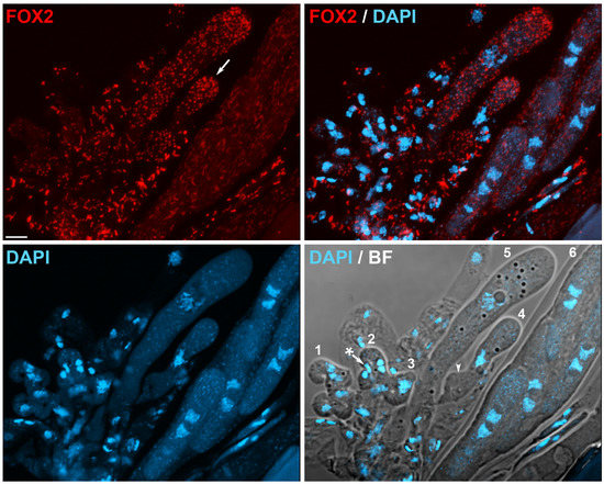 Peroxisome arrangement in representative stages of P. anserina sexual development. The numbering indicates successive developmental stages: (1) Young binucleate croziers. (2) Dikaryotic cell formation (note the lateral cell nucleus—asterisk—migrating into the basal cell to produce a new dikaryotic cell). (3) Karyogamy. (4–5) Asci at successive stages of meiotic prophase-I (arrow indicates peroxisomes concentrated at the ascus apex, arrowhead points to the reminiscent initial crozier cell). (6) Early ascospores. Peroxisomes were labeled with FOX2-mCherry. Nuclei and mitochondrial DNA (mtDNA) were stained by DAPI. BF, bright field. Scale bar, 5 μm. A section of this micrograph was previously reported in [102].