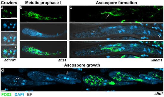 In contrast to S. cerevisiae, the elimination of the fission proteins Fis1 or Dnm1 did not markedly affect mitochondria segregation during P. anserina sexual development. As in other organisms, Dnm1 and Fis1 were required for proper mtDNA distribution in this fungus, and their elimination resulted in the clustering of mitochondrial nucleoids during sexual development (illustrated in Figure 5, arrowheads). Nonetheless, mtDNA segregation was also not noticeably affected during this process [102]. Interestingly, however, Fis1 and Dnm1 were required for peroxisome segregation at two key developmental stages of sexual development. During the dikaryotic stage of DNM1- or FIS1-deleted mutants, peroxisomes present in crozier cells were often elongated and asymmetrically distributed. Actually, several croziers of these mutants, or the dikaryotic cells present in them, contained few, or even lacked, detectable peroxisomes (Figure 5a). In correlation with this finding, several early asci contained small punctate peroxisomes in small numbers, instead of the networks of elongated peroxisomes present in most asci in these mutants (Figure 5b). These asci were interpreted as asci derived from crozier dikaryotic cells that failed to inherit peroxisomes, and their punctate peroxisomes as peroxisomes produced de novo in the ascus [102]. Large networks of elongated peroxisomes with asymmetrical distribution were observed in asci lacking Fis1 or Dnm1 from late meiosis until the stages anteceding ascospore formation (Figure 3). This abnormal arrangement resulted in peroxisomes that failed to be incorporated into ascospores, and in uneven peroxisome partitioning during ascospore formation (Figure 5c) [102]. These observations indicate that the segregation of peroxisomes during the differentiation of asci and ascospores in P. anserina relies on the function of the peroxisome-mitochondrial fission machinery. The finding that the fission machinery was not required for mitochondria segregation indicates different constraints for the segregation of these two organelles, even when their dynamics are regulated by common key factors. These differences might reflect alternative processes involved in more stringently controlling the segregation of mitochondria, organelles that cannot be produced de novo.