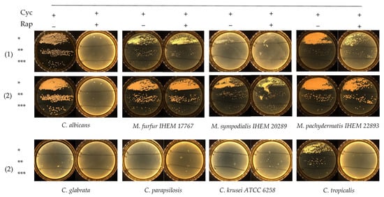 Growth testing via serial inocula dilution of Candida spp. and Malassezia spp. on the FastFung medium without (−) or with (+) 2 mg/L rapamycin (Rap) and 500 mg/L cycloheximide (Cyc). Culture at 48 h (1) and 72 h (2) of incubation. * 105 CFU/mL, ** 104 CFU/mL and *** 103 CFU/mL.