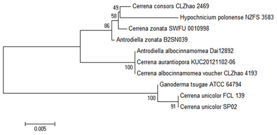 The phylogenetic tree grouped strain SP02 with C. unicolor, C. cosors, C. zonata, C. aurantiopora, C. albocinnamomea, etc., by using the neighbor-joining method. ITS blast of the strain SP02 showed a 100% similarity with C. unicolor FCL 139 (DQ056858.1). Strain SP02 was successfully clustered to C. unicolor and closest to the strain C. unicolor FCL 139, which is reported as an extensive white-rot wood-degrading basidiomycete [22,60]. The morphological characterization and phylogenomic results are consistent with the consensus taxonomic status of C. unicolor and suggested that SP02 is a member of Cerrena. Based on these results, the strain SP02 was identified as C. unicolor SP02.