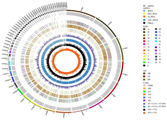 The library was sequenced in the PacBio Sequel Single-Molecule Real-Time (SMRT) instrument [36]. The low-quality PacBio reads were filtered and assembled to generate circular contig without gaps using HGAP4 4.0/Falcon 0.3 of the WGS-Assembler 8.2 [37,38,39,40,41,42]. Then, the genome was recorrected with software Pilon 1.22 using previous Illumina data or Quiver using Pacbio reads. The Prodigal/Augustus gene-finding software, Prodigal 2.6.3 and Augustus 3.3, were used for finding coding genes [43,44]. Cmscan 1.1.2 was used for ncRNA analysis. Transfer RNAs (tRNAs) were detected in the genome using the program tRNAscan-SE with default parameter settings [45]. rRNA were identified by using RNAmmer [46]. The coding genes were annotated with the NCBI NR database by BLAST. Then the functions of the genes were annotated by the Gene Ontology (GO) database [47], and the pathways were annotated using the Kyoto Encyclopedia of Genes and Genomes (KEGG) database [48]. The carbohydrate-active enzyme analyses of the genome was described by Carbohydrate-Active EnZymes Database (CAZymes/CAZys, http://www.cazy.org/, accessed on 24 February 2021) [49]. The proteins encoded by genes were classified on a phylogenetic classification by using the euKaryotic Orthologous Groups (KOG) of the Clusters of Orthologous Groups (COG) database. Genome overview was created by Circos software to show the annotation information [50].