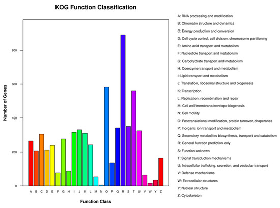 The KOG classification of proteins annotation results showed that a total of 5595 genes were annotated in 2940 KOG categories and assigned to 25 clusters of KOG classifications. As Figure 4 shows, (R) General function prediction of only functional categories contained the largest number of genes (892). The top of the gene-rich KOG categories were associated with function class: (O) Posttranslational modification, protein turnover, and chaperones (582); (T) Signal transduction mechanisms (562); (S) Function unknown (351); (Q) Secondary metabolites biosynthesis, transport, and catabolism (342); (J) Translation, ribosomal structure and biogenesis (331). Moreover, the function classes “Intracellular trafficking, secretion, and vesicular transport” and “Carbohydrate transport and metabolism” involved 276 and 325 genes, respectively. They may be related to the lignocellulosic deposing function of C. unicolor SP02. Secreted enzymes like lignin peroxidase have been known as an important extracellular enzyme to breaks down lignocellulose [12]. Carbohydrate transport and metabolism function are essential in polysaccharides and lignin degradation, which can catalyze the transport of multiple substrates including ions, carbohydrates, lipids, amino acids, peptides, nucleosides, and other small molecules [61].