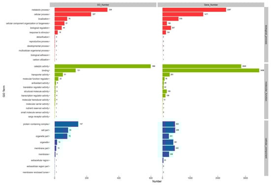GO functionally annotated 5904 protein-coding genes of C. unicolor SP02, in which most predicted proteins have more than one GO term. These genes were functionally annotated with 674 GO terms to understand the major biological and molecular role of the predicted function. Genes were categorized by biological process, cellular component, and molecular function categories. The molecular function class was largest, followed by the biological process and cellular component. As Figure 5 shows, genes were assigned to different GO classes. The genes were mainly assigned to “cell part” (485 genes & 84 GO terms), “protein-containing complex” (452 genes & 147 GO terms), and “membrane part” (445 genes & 79 GO terms) in the “cellular component” category. In the “biological process” category, “metabolic process” (2297 genes & 329 GO terms), “cellular process” (1471 genes & 227 GO terms), and “localization” (578 genes & 78 GO terms) contained most genes, and the two highest classes in “molecular function” category were “binding” (3496 genes & 599 GO terms) and “catalytic” (2845 genes & 131 GO terms).