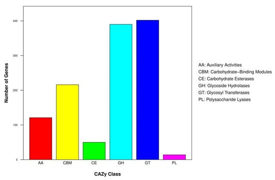 A total of 1193 CAZyme-coding genes of SP02 were annotated, included 402 Glycosyl Transferases (GTs), 390 Glycoside Hydrolases (GHs), 216 Carbohydrate-Binding Modules (CBMs), 121 Auxiliary Activities (AAs), 50 Carbohydrate Esterases (CEs), and 14 Polysaccharide Lyases (PLs), which accounted for 33.70%, 32.69%, 18.11%, 10.14%, 4.19%, and 1.17%, respectively (Figure 7). To degrade the polysaccharides, wood decay fungi secrete a variety of GHs and CEs classified into various sequence-based CAZys families and their appended CBMs. In various CAZys, GHs are the most diverse group of enzymes in the degradation of biomass. A lot of GHs families have been classified to date [64]. Many of them are responsible for the hydrolysis of the carbon-oxygen-carbon bonds that link the sugar residues in cellulose and hemicelluloses [65,66]. Among those likely involved in cellulose degradation, genes of GH1, GH3, GH5, GH6, GH7, GH12, GH45, and GH55 were represented and identified. To digest hemicellulose, GH3, GH10, GH12, GH43, GH51, and GH79 were assigned. Plant pathogenic, hemibiotrophic, and necrotrophic fungi generally contain more GH1 degrading enzymes than biotrophic fungi, which have almost none [67]. The genome of SP02 encodes five GH1 genes, indicating that it tends to a necrotrophic lifestyle. Rich CBM1 genes were engaged to help SP02 attach mainly to crystalline cellulose and may serve to concentrate enzymes on cellulose surfaces [68]. Esterases of SP02 were mostly distributed in the CE4, CE6, CE8, CE11, CE12, and CE16 classes. These CEs help the O-de-N-deacylation of acetylated glycosyl residues in hemicellulose, pectin, and lignin units of the plant [69]. GH 29 fucosidases and pectate lyases belong to PL1 and PL3 possessed in SP02 suggested that the fungi probability have the ability of weak parasitism associate with the occasional observation of C. unicolor on alive trees [60]. In the classification of the CAZymes database, lignin-degrading enzymes were subdivided into the AA classes [12]. CAZyme results showed that SP02 possesses a large number of AAs, including lignin-oxidizing enzymes AA1, AA2, AA3 classes; lignin-degrading auxiliary enzymes AA4, AA5, AA6 classes; polysaccharide decomposing related AA7, AA9, AA10 classes; and pyrroloquinoline quinone-dependent oxidoreductase class AA12. These CAZymes represent specific functions and colonize the ability of various plant substrates. Most predicted CAZyme-coding genes supporting the saprophytism lifestyle of SP02 by using lignocellulosic sources indicate that SP02 maintains great enzymatic diversity supporting lignocellulose attack, which is probably based on polysaccharide degradation and oxidation-reduction activity.