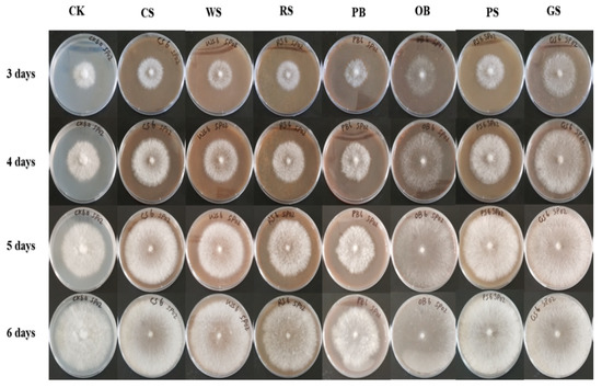 Data in Figure 8 record the growth of C. unicolor SP02 colony on a plate by using different agro-waste substrates as a single carbon source. SP02 appeared to use all of the tested agro-industrial waste. Early development of SP02 is commonly characterized by initial diffuse growth and branching of individual hyphae, which then resolve into cords as the growing front moves outward. The colony size and number of hypha links increase through time. Then with fast growth, the colony center is characterized by selective loss of connections and thinning out of the fine mycelium and weaker cords that give rise to a decrease in the network density with increasing colony area on the lignocellulosic carbon source. A sparse branching tree-like structure forms in the peripheral growth zone from tip growth and sub-apical branching. With the growth colony, edges become denser and full of overlapping hyphae. By contrast, the colony on control (glucose) kept dense mycelium around the colony center. In plates of lignocellulosic carbon source, solid substrate presented at the bottom of medium showed no direct contact with healthy developed hypha. Close observation obtained a clear circle around the edge of the colony, which is common in the ligninolytic product process and explained as a higher amount production of secondary metabolites [95]. In this case, the fading color of substrates wrapped in agar means white-rot affection of SP02 still exist under these nutritional condition.