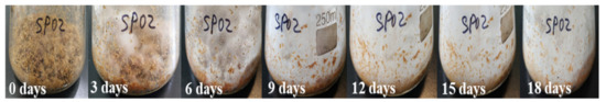 The substrates grain of plant particles decreased in size after the treatment with strain SP02 in SSF. The variation in appearances of substrate grain was also observed as shown in Figure 9. The change in appearances and size is due to consumption of corn stalk as discussed in Table 4. The decolorization of corn stalk materials suggested that efficiency of lignolytic oxidize system of SP02 decreased chromophoric groups such as carbonyl, quinone and phenol hydroxyl in lignin of lignocellulose. Reduction of particle size, porosity, lignin structural disturbance as well as cellulose access, crystallinity, polymerization degree, hemicellulose shielding and cellulose fibers packaging were all emphasized as parameters affecting digestibility of varying degrees and in various hydrolyte process stages [115,116,117].
