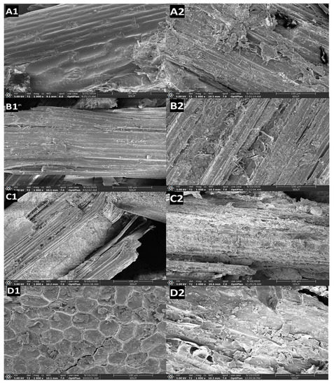 SEM images of SSF cultures: (A1) untreated corn stalk; (A2) C. unicolor SP02 treated corn stalk; (B1) untreated wheat straw; (B2) C. unicolor SP02 treated wheat straw; (C1) C. unicolor SP02 treated rice straw; (C2) C. unicolor SP02 treated rice straw; (D1) untreated pine bark; (D2) C. unicolor SP02 treated pine bark.