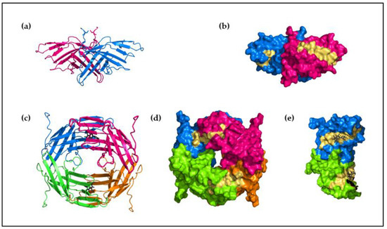 Protein structure of Alt a 1: (a) Schematic diagram of the dimeric structure of Alt a 1 in its “butterfly” shape; (b) molecular surface of the dimeric structure of Alt a 1. Chains are shown in different colors and the position of the epitopes are shown in yellow, the epitopes are oriented to the outside of the structure leading the interaction with IgE antibodies; (c) schematic diagram of the tetrameric structure of Alt a 1; (d) molecular surface of the tetrameric structure of Alt a 1, chains are shown in different colors and the epitopes in yellow; (e) detail of the tetrameric molecular surface, showing the IgE binding epitopes (yellow) buried in the structure. PDB code, 3v0r.
