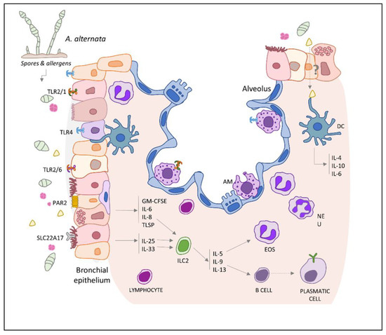In the literature, there are many murine models, in which the application of extract or only spores show airway hyperreactivity, mucus hypersecretion, humoral response, lung inflammation, and eosinophilic infiltration, among other effects related to airway diseases. Furthermore, in these models, the production of type 2 cytokines IL-4, -5, and -13, as well as high levels of Alternaria specific IgE is also observed [54,72].