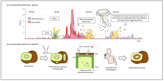 Co-sensitization phenomena between Alternaria and other allergens: (a) asthma exacerbation by sensitization to Alternaria grass pollen. In Central Spain, grass pollen patients suffer from asthma during late summer and early fall, when pollen is no longer present. In contrast, in this season, Alternaria spore peaks were registered (data from Ciudad Real, 2020, SEAIC, https://www.polenes.com/es/home, accessed on 1 October 2021). Considering that thunderstorms and grass postharvest are common at this time, the authors described the role of spores as Group-1 grass allergen carriers and suggested that the inhalation of loaded spores may be the cause of the asthma exacerbations in grass pollen patients; (b) Alternaria, kiwifruit co-sensitization. Alternaria infects kiwifruits secreting Alt a 1 that can be detected in pulp at 5 days post infection (dpi) while fungal hypha is not visible. The partial inhibition of a PR5 thaumatin-like protein (Act d 2) by Alt a 1 was reported, evidencing the role of the fungal protein in plant pathogenesis, and providing an explanation for the co-relation between Alt a 1 and Act d 2 sensitizations as a result of consumption of Alternaria-infected kiwifruits but apparently in good conditions.