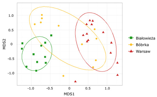 Non-metric multidimensional scaling (NMDS) analysis with the Bray–Curtis distance metric was used to analyze the fingerprints obtained from the ARISA analyses (Figure 1), with a probability ellipse (standard deviation, p = 0.68) for each location. The fungal communities inhabiting the phyllosphere of the hornbeam trees growing in the nonpolluted Białowieża National Park and in the polluted city center of Warsaw were significantly different (ANOSIM; R = 0.8, p = 0.001). Furthermore, the phyllosphere fungal communities of Białowieża and Bóbrka showed differences, although less remarkable, between their fungal communities (ANOSIM; R = 0.45, p = 0.001). A bigger internal variation was noticed in the fungal communities of the phyllosphere of Bóbrka in comparison to the other sampling areas. Fungal communities on each subsite within the Białowieża National Park differed less than for the other sites. Hence, in Białowieża, the lowest variation between biological replicates was observed. In addition, differences were noticeable between the phyllosphere fungi of Bóbrka and those of Warsaw; however, the separation between these communities was less strong (ANOSIM; R = 0.33, p = 0.001).