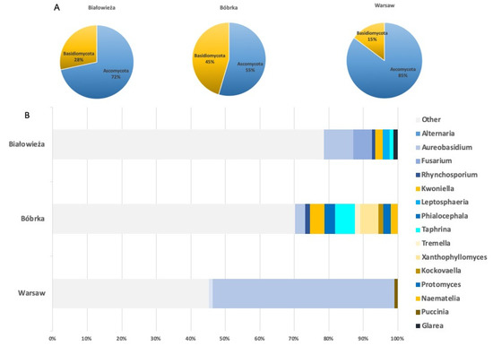 Total epiphytic fungal communities at the three locations according to shotgun metagenomic analyses. (A) Relative abundances for Ascomycota and Basidiomycota in the phyllosphere of the National Park of Białowieża, the crude-oil-polluted site of Bóbrka, and the city center of Warsaw. (B) Relative abundances of classified fungal genera, with a cut-off value of ≥1.0%.