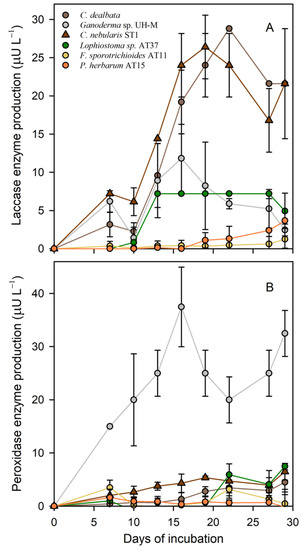 Among the selected epiphytic fungal strains, F. sporotrichioides AT11, P. herbarum AT15, and Lophiostoma sp. AT37 produced laccase and peroxidase enzymes in Kimura medium (Figure 3). The activities of both enzymes were determined starting from day seven since the beginning of the incubation. Lophiostoma sp. AT37 had the comparatively highest laccase activity and started producing the enzyme from 10 days, showing an activity of 7.2 μU L−1 at its highest. For 14 days, the laccase activity remained steady, and after this, it decreased. P. herbarum AT15 and F. sporotrichioides AT11 started producing laccase from days 19 and 27, respectively, with activities of 3.62 μU L−1 and 1.24 μU L−1 (Figure 3). The differences in laccase activities between the different fungi were statistically not significant, but the Ascomycete Lophiostoma sp. AT37 together with the basidiomycetes that were used as positive controls exhibited the highest activities.