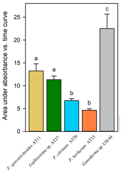 Hydroxyl radical production was estimated for the selected epiphytic fungi Lophiostoma sp. AT37, F. sporotrichioides AT11, P. herbarum AT15, and P. citrinum AT26. Ganoderma sp. UH-M was used as control (Figure 4). The hydroxyl radical production for F. sporotrichioides AT11 and Lophiostoma sp. AT37 was significantly higher than for P. citrinum AT26 and P. herbarum AT15. Ganoderma sp. UH-M demonstrated the significantly highest hydroxyl radical production.