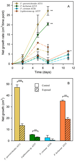 Tolerance test of epiphytic fungi, exposed to naphthalene and benzene, over time. The four selected epiphytic strains are represented (A) by the colored lines, showing the mean of the net growth rate per time point ± SD. Means based on the three replicates per each sample were calculated. A solid line indicates the non-exposed condition, and a dotted line indicates the exposed condition for each strain. (B) Net growth, at the last day of the growth assessment, for each strain. Statistically significant differences are indicated after performing Student’s t-tests by * (p ≤ 0.05), ** (p ≤ 0.01), and *** (p ≤ 0.001).