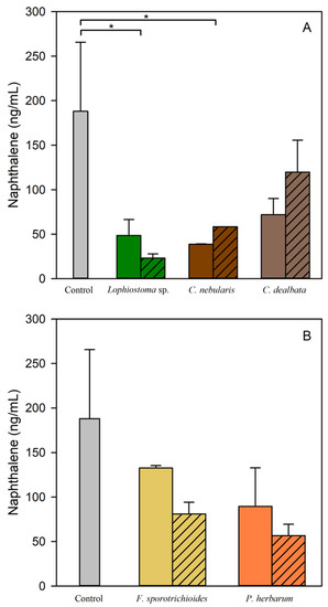 Gas chromatography mass spectrometry (GC-MS) measurement of naphthalene degradation by (A) the epiphytic fungus Lophiostoma sp. AT37 and the two strains used as positive controls for laccase and peroxidase production: C. nebularis and C. dealbata, growing on Kimura medium, and (B) the epiphytic fungi F. sporotrichioides AT11 and P. herbarum AT15, growing on Ingestad medium containing 2.5 g L−1 fructose and 2.5 g L−1 glucose, with shaded bars indicating the CuSO4-exposed condition. No-fungus media controls are indicated in gray. Statistically significant differences are indicated after performing one-way ANOVA by * (p ≤ 0.05).