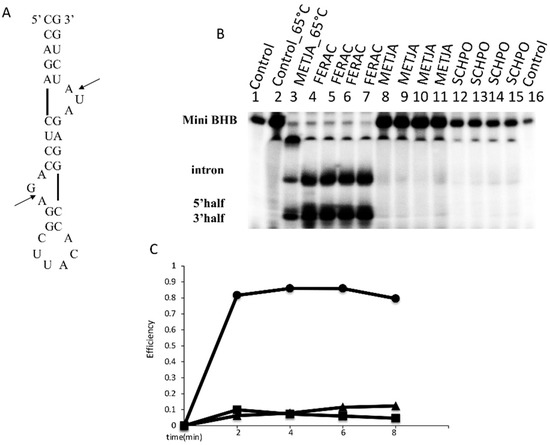 RNA cleavage assay. (A) Mini BHB substrate for the in vitro cleavage assay. Arrows indicate the splicing sites. (B) The mini BHB substrate was incubated with three different enzymes, in the reaction conditions as reported in the Section 2. The cleavage products were analyzed by electrophoresis on 10% polyacrylamide gel containing 29:1 monomer to bis and 8 M urea, followed by autoradiography. The identification of the reaction products is indicated. Lane 1–2 contain the control (C, no enzyme added) incubated at 30 °C and 65 °C. Lanes 4–7, 8–11, and 12–15 show the products after incubation with the endonucleases from FERAC, METJA, and SCHPO, respectively. Lane 3 shows the products following incubation at 65 °C in the presence of the METJA enzyme. Lane 16 contains purified T7 transcribed substrate not being incubated. (C) Splicing plateau levels showing the functionality of each of the three enzymes at 30 °C. All reactions were performed at 1 mM RNA and 2 mM enzyme under the conditions reported in the Section 2. Δ, SCHPO; □, METJA; O, FERAC.