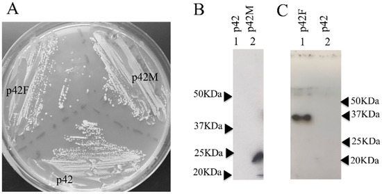 As a first step, the genes coding for the METJA and FERAC enzymes were cloned into pREP42-HMN under the control of a medium-strength promoter and a transcriptional termination element of the thiamine-repressible gene nmt1 [30,35,36]. This vector enables the episomal expression of a tRNA endonuclease fused to tag sequences. The expressed protein presents an N-terminal tag comprising two copies of the Myc epitope and six histidine residues [30]. The SCHPO strain IHSP365 with genotype h− leul.32 ura4.d18 was used to determine if the expression of the exogenous protein could be toxic to SCHPO. The toxicity was tested by streaking the transformed cells on plates with different concentrations of thiamine [37]. Figure 2A shows that expressing the enzyme from FERAC (p42F), METJA (p42M), and the empty vector (p42) in the absence of thiamine, therefore under maximal inducing conditions, is not deleterious to SCHPO growth. To investigate the expression levels of the enzymes, Western blot analysis of whole cell extracts was carried out using an antibody specific for the Myc-tag [30] (Figure 2B,C). No strongly immunoreactive proteins were detected in lane 1B and 2C (the vector control); moreover, the antibody gave a negligible background. On the contrary, in lanes 2B and 1C, single bands of the predicted size were detected, showing that the expression of the fusion proteins was successful.