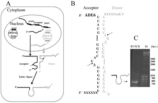 Figure 3A summarizes the technique used in vivo. Two transcripts, one expressed episomally and designated as the donor, and one encoded in the genome and designated as the acceptor, combine to generate a BHB that serves as the substrate for the exogenous FERAC tRNA endonuclease. The SCHPO leucine and uracil autotrophic strain IHSP365 was transformed with two compatible vectors, pREP42, which contains the tRNA endonuclease gene, and pREP41, which contains a sequence whose transcript (donor) cannot code for a full protein unless it forms a BHB motif with an endogenous mRNA transcript (acceptor).