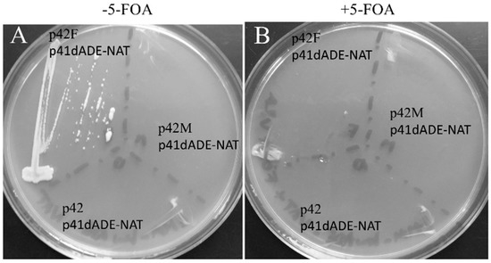 Yeast harboring the mutation of this gene can survive only if adenine is present in the growth medium. The donor is a gene that codes for Streptomyces noursei nat1, encoding an N-acetyltransferase (NrsR) that monoacetylates nourseothricin (NAT), an inhibitor of ribosomal protein synthesis that induces miscoding during translation in a wide range of prokaryotic and eukaryotic organisms [39,40,41]. This gene, cloned into pREP41-HMN, presents an upstream sequence designed to form a BHB structure upon interaction with the ADE6 mRNA (Figure 3B). The NrsR ORF is out of frame and can be translated only if the BHB structure is formed, and is cleaved by a tRNA endonuclease. To examine the splicing product, we analyzed the final RNA product by RT-PCR. The product of the reaction was analyzed by electrophoresis on an agarose gel, Figure 3C shows a band that in size corresponds to the recombinant RNA. The translational product resulting from the recombinatorial event between ADE6 and NrSR mRNA should be a chimeric protein that presents the N-terminus of ADE6 and, at its C-terminus, the NrsR protein that confers resistance to NAT. SCHPO strains transformed with pREP41dADE_NAT and either with pREP42-HMN or pREP42-METJA (p42M) or pREP42-FERAC (p42F) were streaked on EMM plates containing NAT and adenine, in the absence of thiamine. Only the strain carrying the plasmid p42F (Figure 4A) was resistant to the antibiotic, as a consequence of the action of the FERAC enzyme. The strains were also streaked on the same medium but this time containing 5-fluoroorotic acid (5-FOA) and uracil at low concentration. Because the plasmid pREP42 contains a ura4+ selectable marker encoding orotidine 5’-phosphate decarboxylase that converts 5-FOA into the toxic compound 5-fluorouracil, causing cell death, cells harboring this vector cannot grow unless they lose the plasmid. Figure 4B shows that the strain expressing the FERAC endonuclease cloned into pREP42 was now sensitive to the 5-FOA.