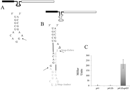 To produce a substrate that is cleaved only by the FERAC enzyme, we decided to use an in vivo approach based on the β-galactosidase (lacZ) assay [32,33]. As a first step, the mRNA sequence of lacZ was searched, using the RNABOB program [31] with a descriptor (Section 2), to find a hairpin presenting a six-base pair helix and a seven-nucleotide loop (Figure 5A). This step is necessary for two reasons: first, the hairpin resembles the anticodon arm structure of a mature tRNA, and therefore should facilitate the action of the endogenous tRNA ligase following the removal of the intron; second, it does not require the introduction of an exogenous hairpin that could otherwise impair either the transcription or the translation of the mRNA encoded by the target gene. We decided to insert into the hairpin of the β-galactosidase gene an intron capable of folding into a BHB structure. This BHB motif presents a two nucleotides bulge at the 5′ splicing site and a three nucleotides bulge at the 3′ separated by a 4-bp helix (Figure 5B). A β-galactosidase gene presenting such an intron was cloned into pREP41-HMN (p41Zb). The presence of the intron results in a transcript that is out of frame and cannot be translated into β-galactosidase. The strain IHSP365 was transformed with the vector p41Zb, in the absence or the presence of p42F, and as a control the same strain was transformed with the p41 vector alone. Transformant colonies were selected on EMM in the case of the strain carrying p42F and p41Zb, while cells carrying only p41Zb or p41 were selected on EMM containing uracil. To accurately monitor the regulation of the expression of the genes under test, we used a β-galactosidase in vitro assay to provide a sensitive and quantitative assessment of β-galactosidase activity by measuring the hydrolysis of the Ortho-nitrophenyl-β-D-galactopyranoside (ONPG) substrate into galactose and the chromogenic compound orthro nitrophenol.