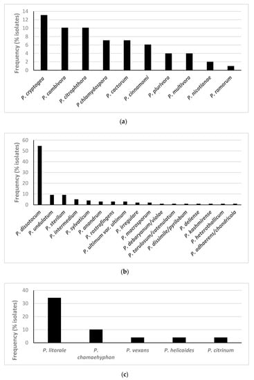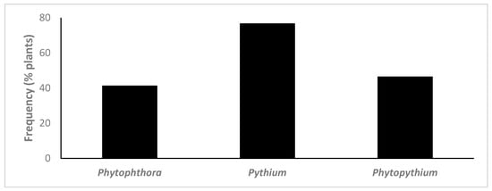 The Phytophthora species isolated most frequently was P. cryptogea, from 13.1% of plants, followed by P. x cambivora and P. citrophthora, both isolated from 10.1% of plants (Figure 2). Of the Pythium species, P. dissotocum was isolated from 54.5% of the plants tested, followed by P. undulatum in 9.1%. The most common Phytopythium isolated was P. litorale, present on 34.3% of the plants, followed by P. chamaehyphon (10.1%) (Figure 2, Table S1).